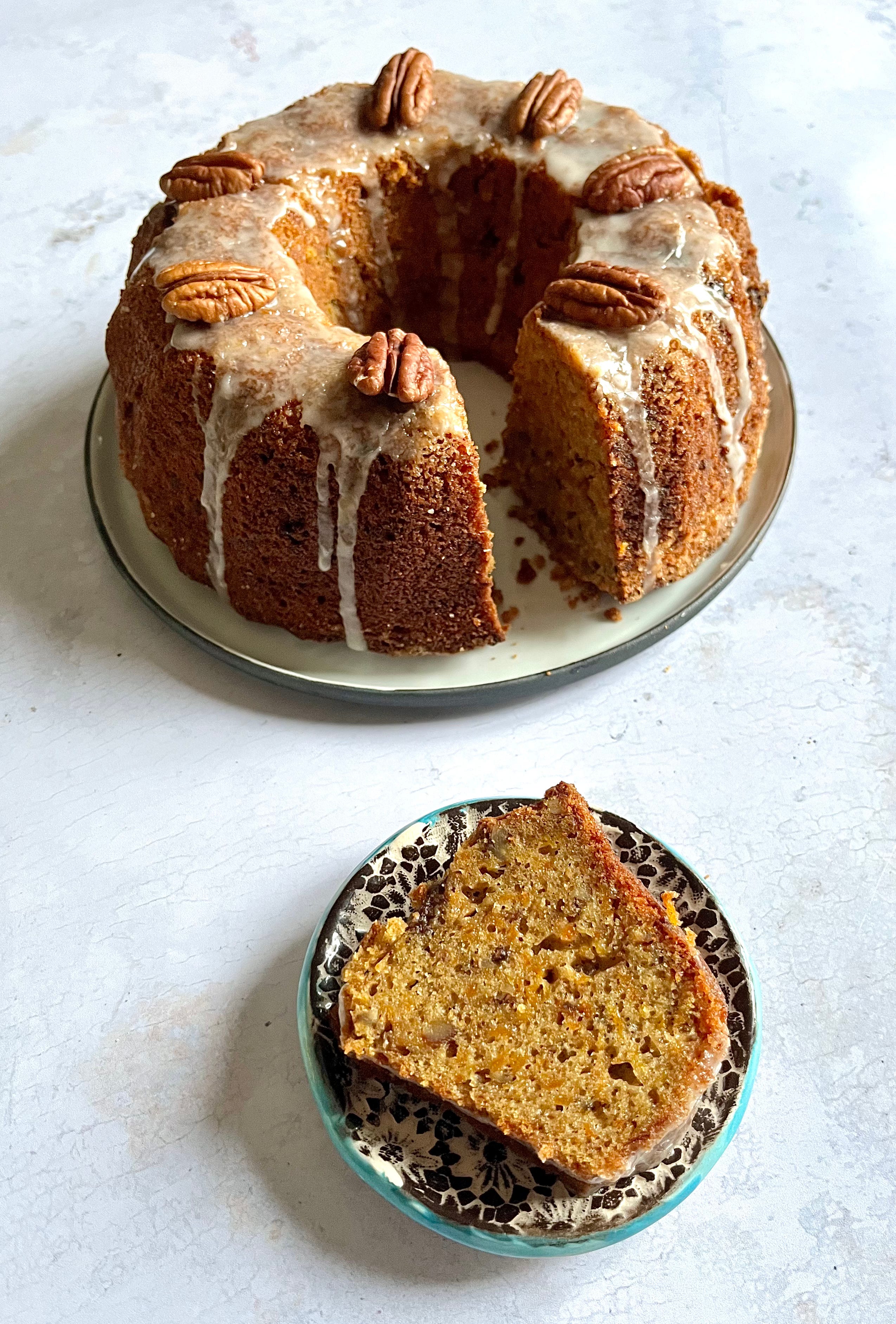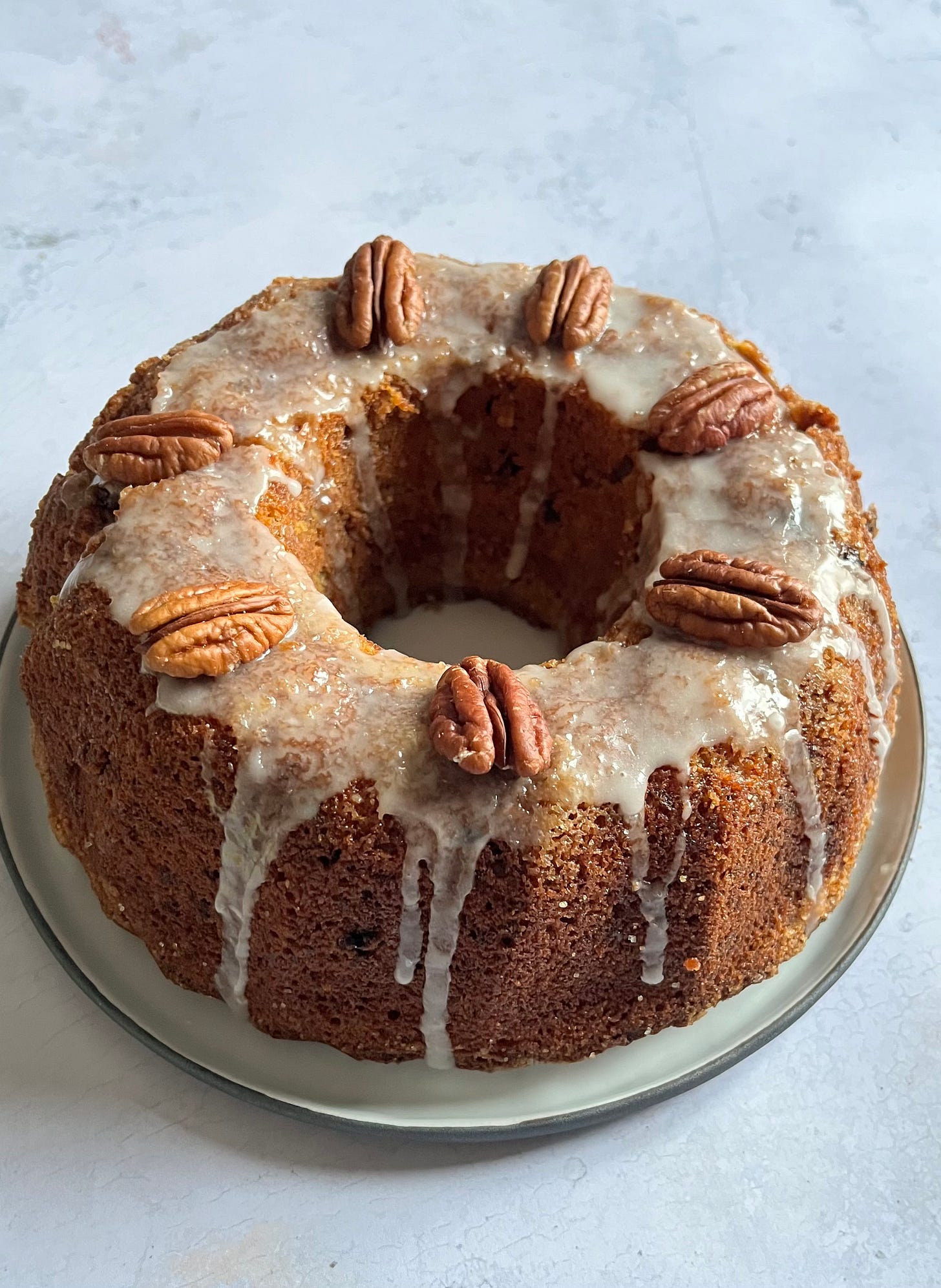 Préparez le glaçage : versez le sucre glace dans un petit bol puis ajoutez assez de jus de citron pour avoir un mélange épais mais légèrement coulant. Étalez le glaçage juste sur le dessus du gâteau puis déposez quelques noix de pécan.