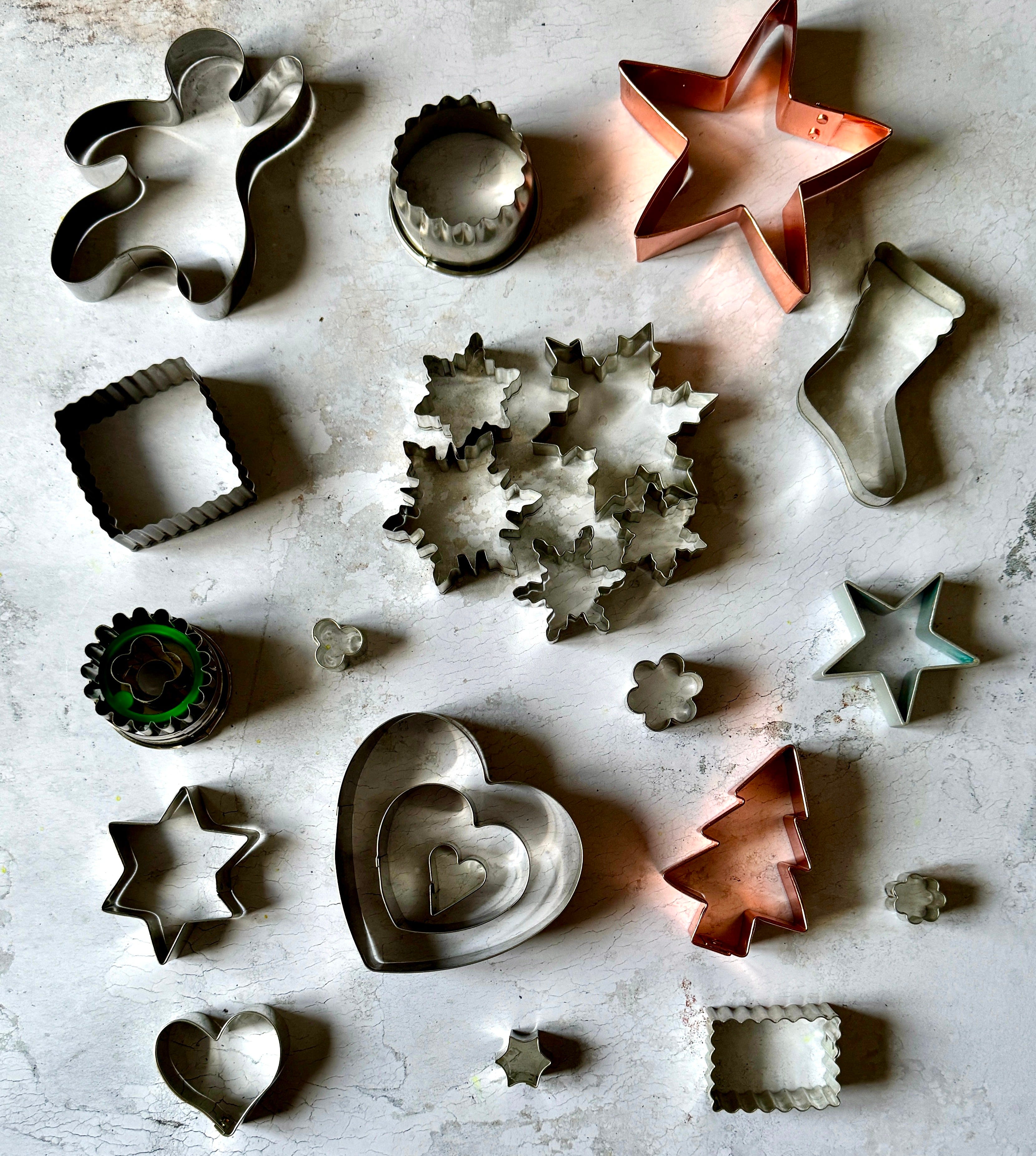 Dans les recettes qui suivent, je n’indique pas ce que vous devez faire des chutes pour ne pas alourdir les textes. Il faut bien entendu les utiliser pour arriver à la quantité de biscuits indiquée dans chaque recette. Pour ce faire, formez une boule avec les chutes, étalez-la entre 2 feuilles de papier cuisson (même épaisseur que la recette d’origine) puis réservez au frais pendant 15 minutes avant de détailler de nouvelles formes et de les faire cuire.