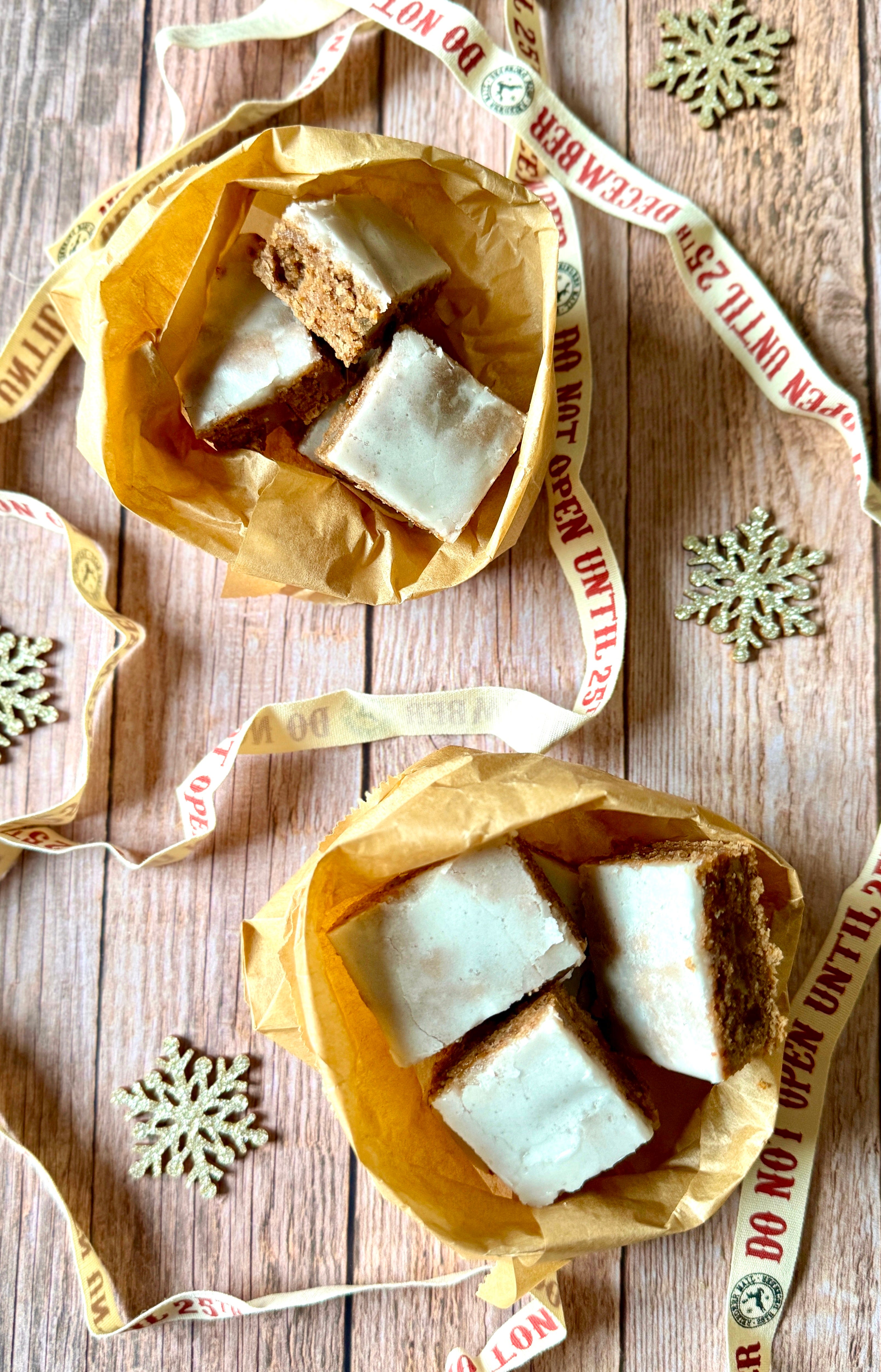 Gros coup de cœur pour cette nouvelle recette. Je suis une adepte des lekerlis, sorte de petits pains d’épices plats, mais je les trouve souvent secs et décevants. Cette version chipée dans le nouveau livre de Christophe Felder et de Camille Lesecq “Petits Gâteaux de Noël et Bredele, 40 recettes pour préparer les fêtes” est un bon compromis. Ces carrés sont très faciles à faire et sont bien moelleux. On est clairement dans l’esprit de Noël, mais avec une touche de modernité. Je vous conseille d’attendre au moins une journée avant de les déguster car ils développent plus d’arômes.