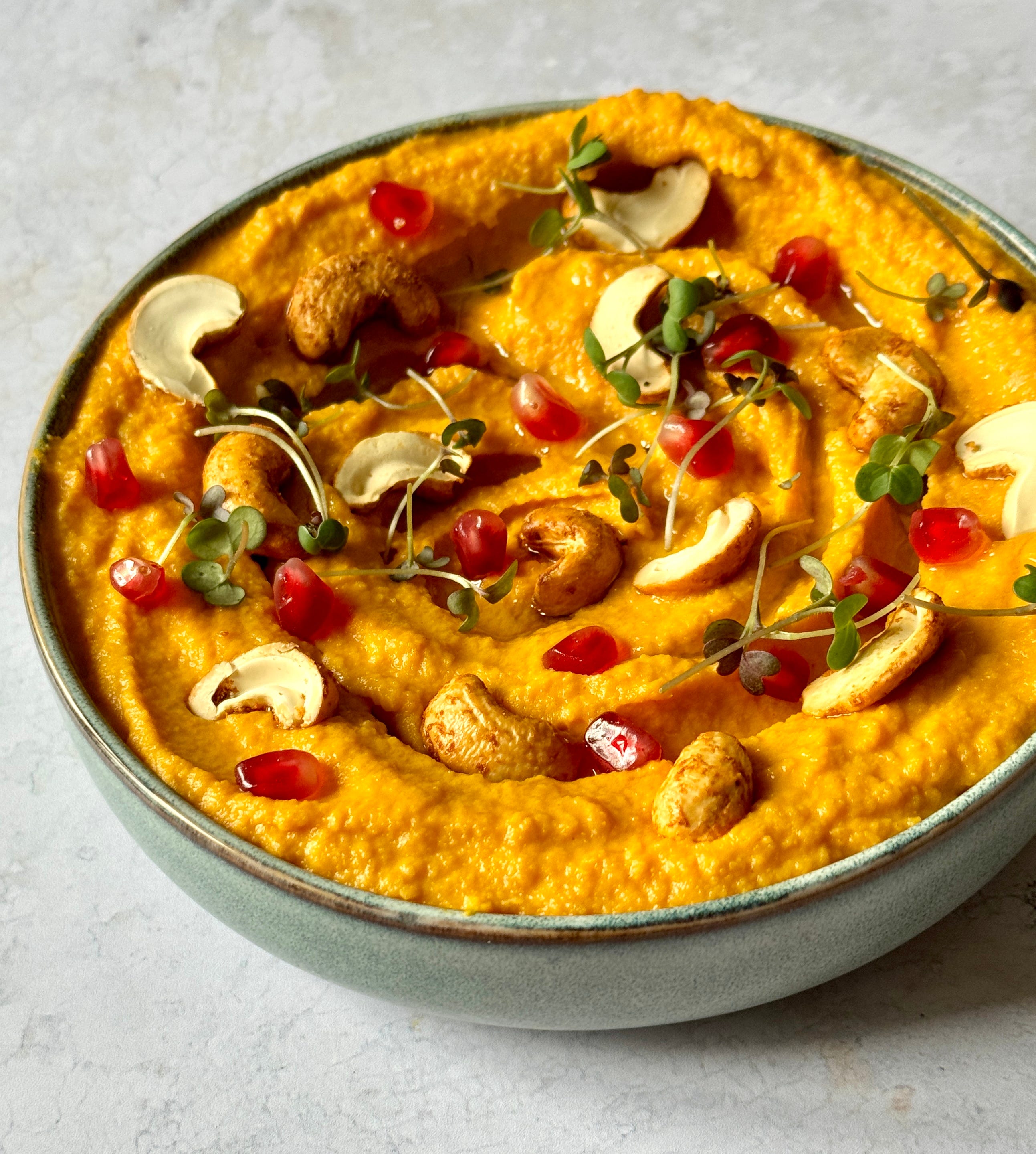 La préparation de la tarte tourbillon a impliqué de détailler une montagne de lanières de carottes. Si vous avez déjà fait cela, vous savez que cette opération vous laisse avec le cœur des carottes, car on ne peut pas prélever les lanières jusqu’au bout. J’en ai profité pour préparer cette crème avec le cœur des carottes mais vous pouvez utiliser des carottes entières bien entendu. Je ne l’appelle pas houmous, même si elle contient des pois chiches, il y a des monuments culinaires auxquels je n’ai pas envie de me frotter. C’est une chouette recette à avoir au frais pour une petite faim, pour accompagner des légumes rôtis ou du poulet grillé. Vous pouvez aussi la servir à l’apéro avec des crackers.